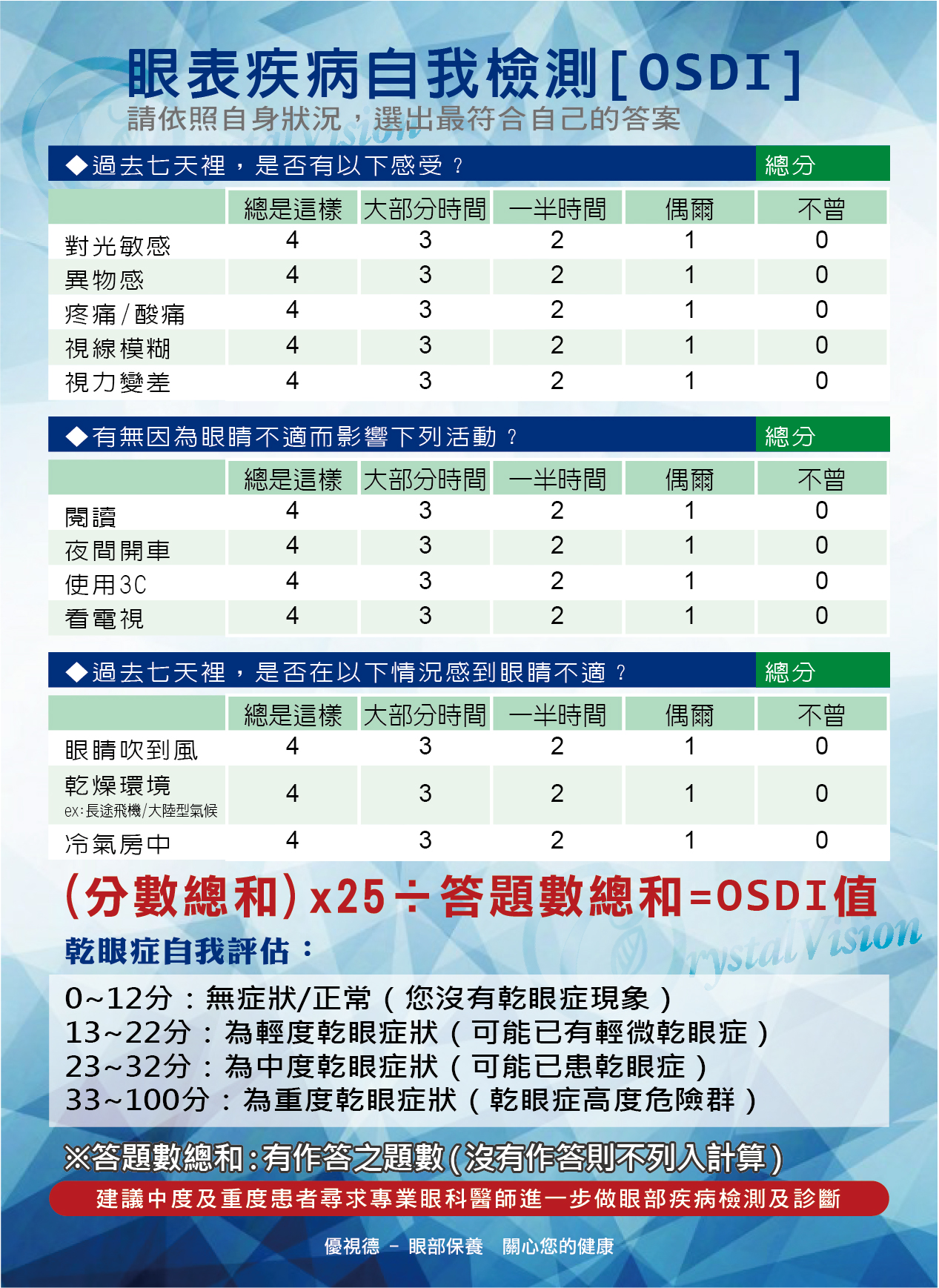 乾眼症自我檢測表-眼表疾病(OSDI) 眼睛不適是否正在無聲無息地影響你? 眼睛是我們的靈魂之窗,但在3C產品發達的時代,許多人用眼過度,加上不正確的用眼習慣,長期下來造成眼睛的不適感與乾眼症狀出現等, 讓我們透過 OSDI 乾眼症自我檢測表,檢視您眼睛的健康狀況! 檢測過後,即可讓您更進一步了解是否有乾眼症問題! 也請記得定期做視力及眼部相關檢查唷!